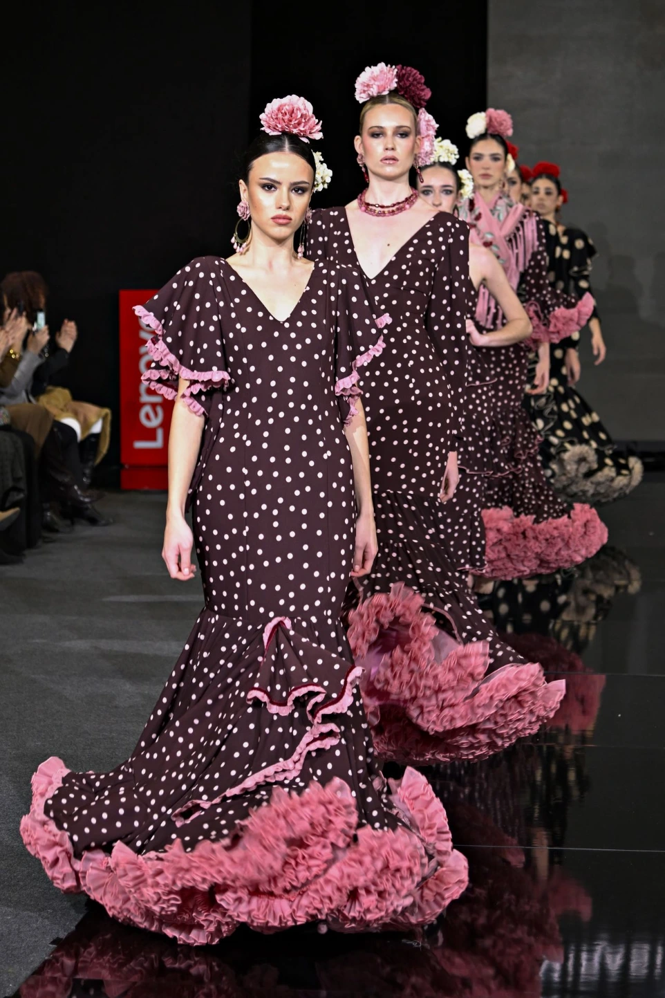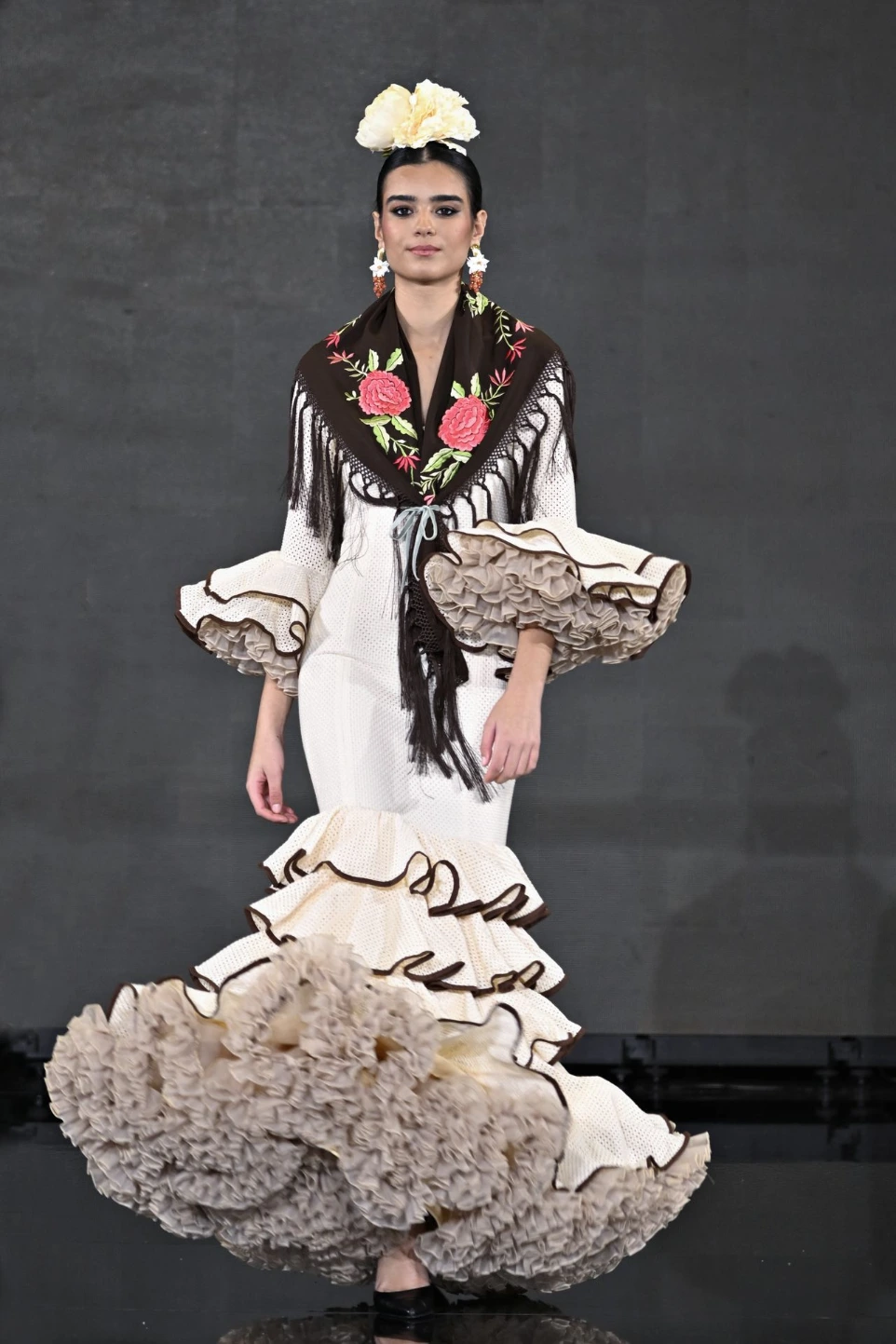 La colección en Flamencor combinó propuestas en las que se presentaban vestidos de flamenca en estampados de lunares, de flores y de tejidos perforados, junto a su reinterpretación para eventos especiales, como la emblemática “Noche del Alumbrao”.